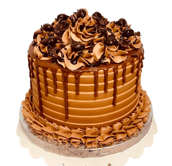 Turtle Delight – Chocolate cake filled with milk chocolate ganache and iced in caramel buttercream with a milk chocolate drip and decorated with Turtle chocolates.